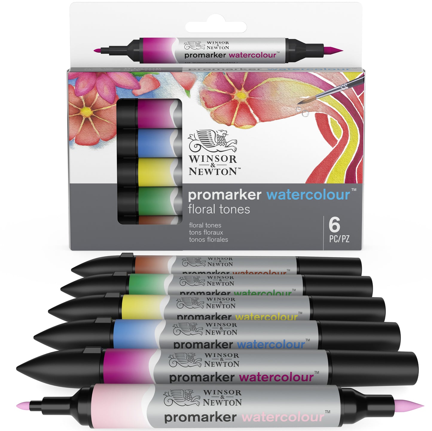 The 6-Marker Floral Tones Set includes pale rose, quinacridone magenta, mid blue, lemon yellow hue, Hooker's green and burnt red
