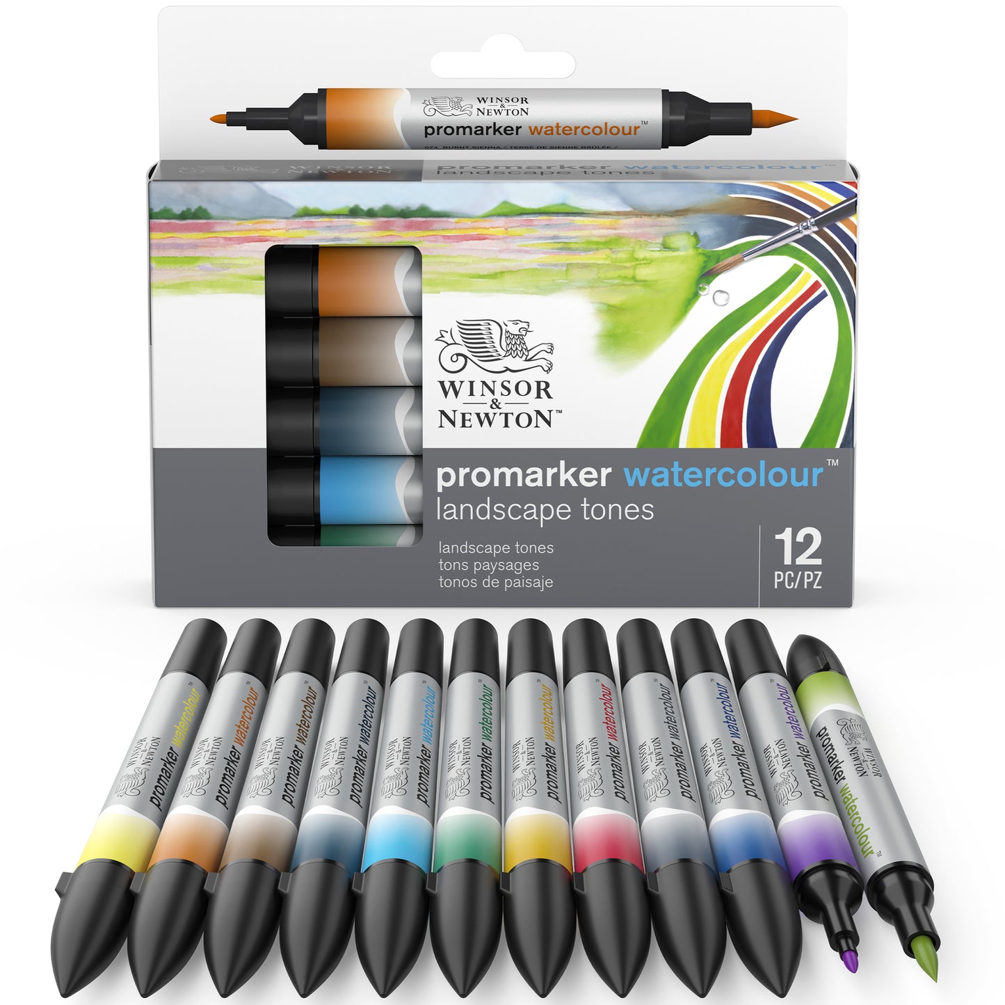 The 12-Marker Landscape Tones Set includes lemon yellow hue, raw sienna, burnt sienna, cadmium red deep hue, burnt umber, Payne's gray, indigo, pthalo blue (red shade), cerulean blue hue, dioxazine violet, Hooker's green dark and sap green