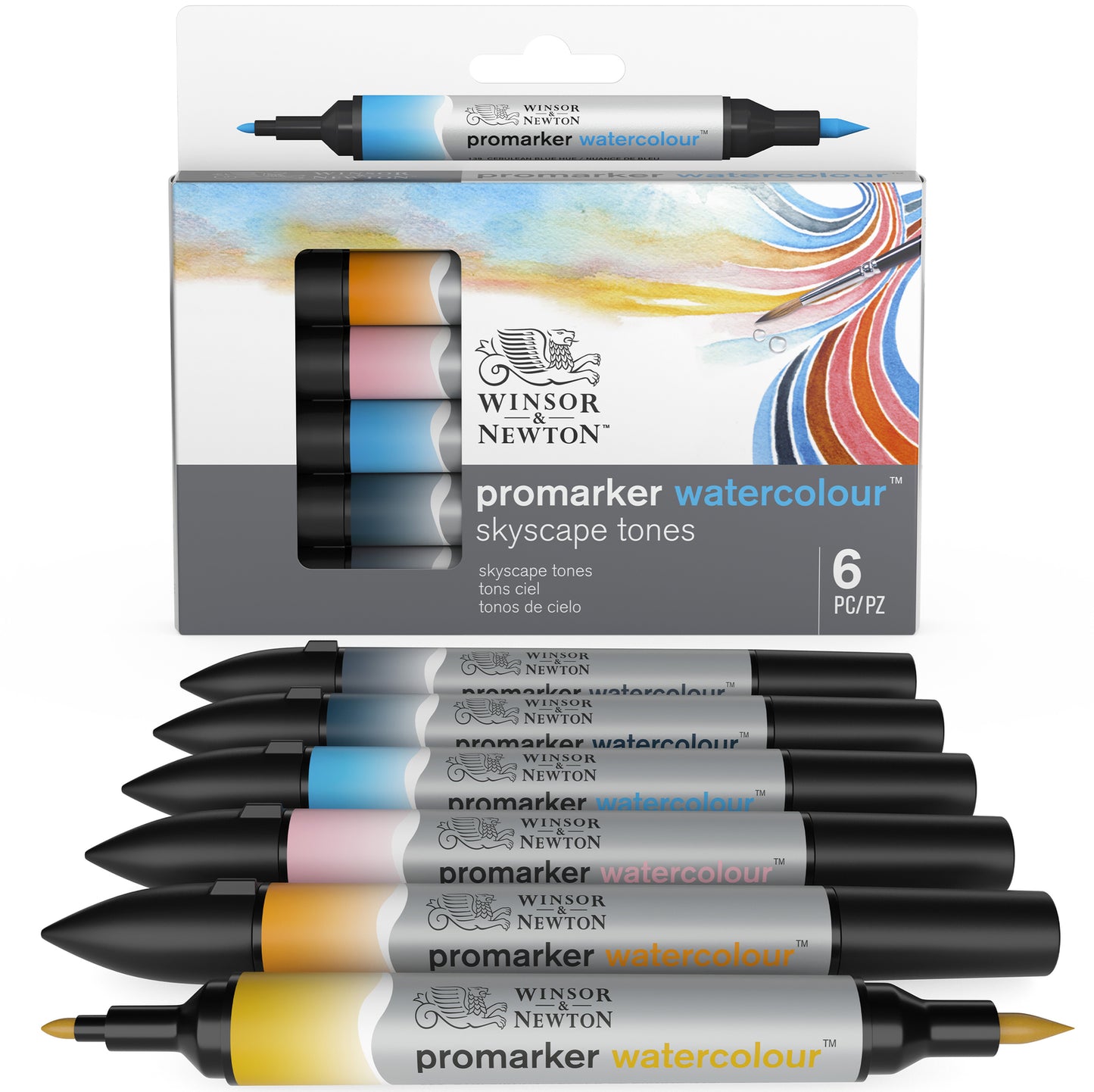 The 6-Marker Sky Tones Set includes raw sienna, cadmium orange hue, pale rose, cerulean blue hue, indigo and Payne's gray